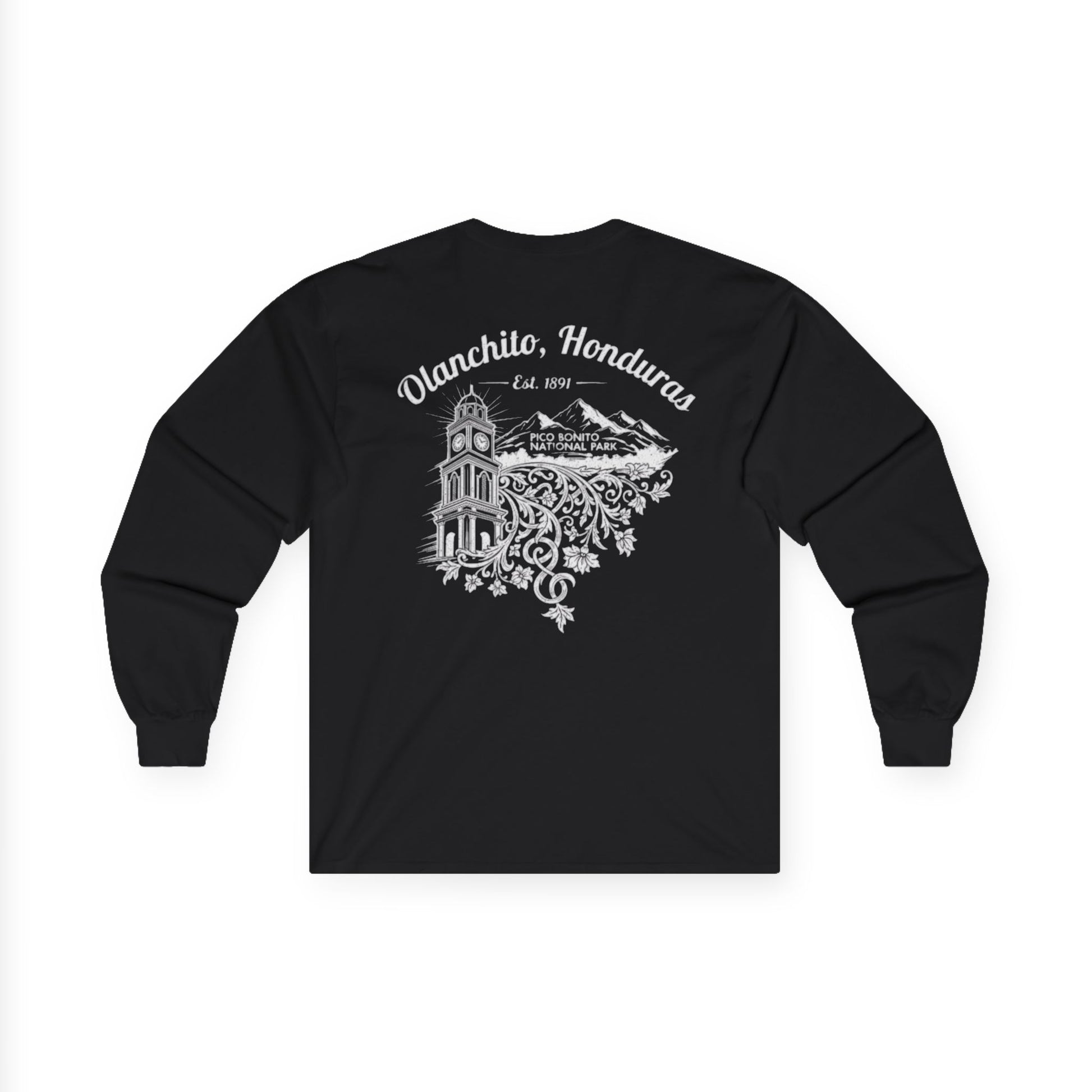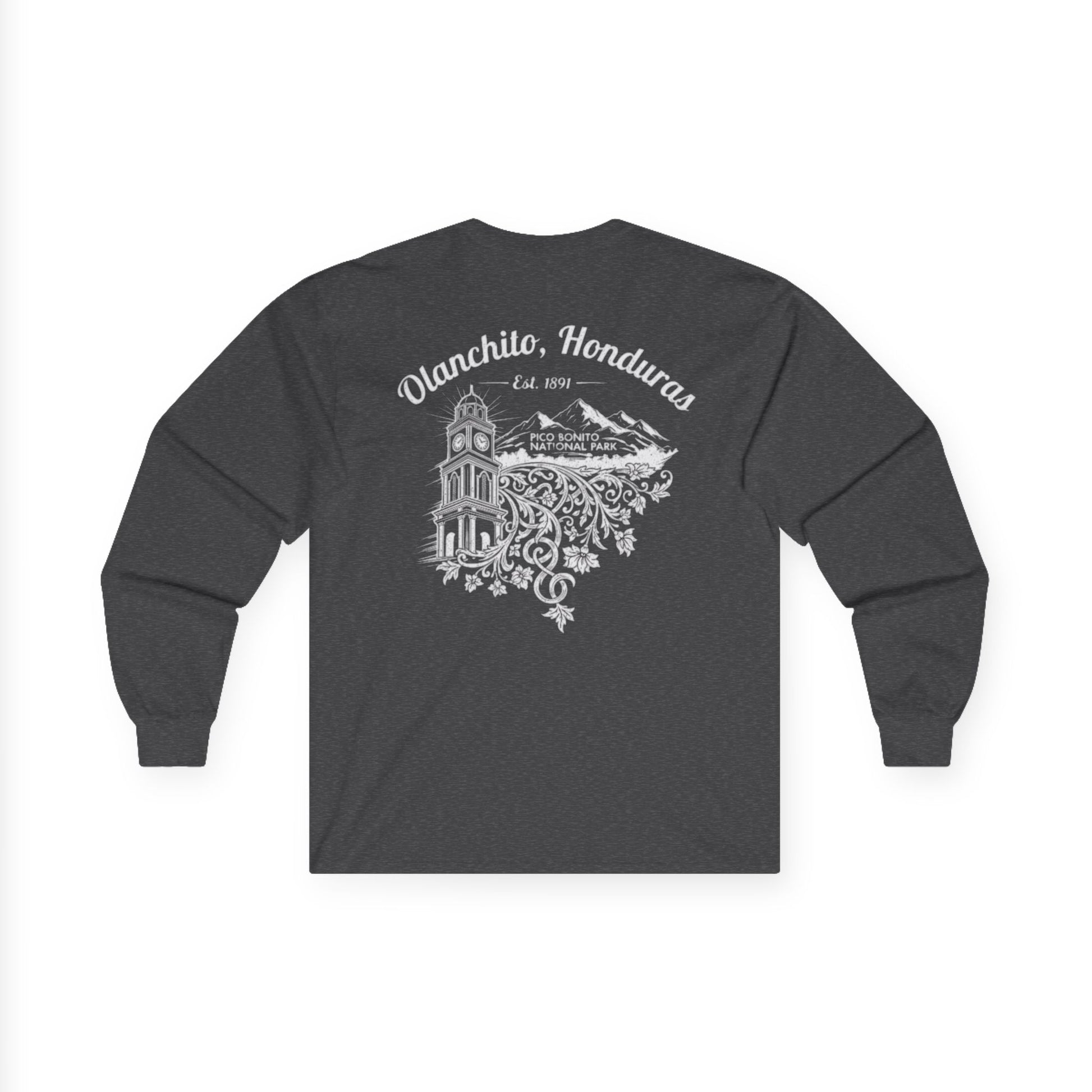 This design celebrates the iconic landmarks of Olanchito, Honduras, with a clean and bold aesthetic. It prominently features a highly-detailed illustration of the city's clock tower, set against the majestic backdrop of the local mountains. The vintage-style typography and crisp white-on-black color scheme give it a timeless, classic look. This shirt is perfect for anyone who wants to showcase their pride in Olanchito's history and natural beauty the ultimate Unisex Ultra Cotton Long Sleeve Tee, designed for those who cherish comfort, style, and sustainability. This shirt delivers a vintage feel with its environmentally-friendly cotton fabric, perfect for casual wear or lounging at home. Whether you’re heading out for a relaxed day or cozying up with friends, its classic fit ensures you look effortlessly chic. Ideal for adults, this tee is a fantastic choice for holidays, birthdays, or just a simple gift for someone special. Its elegant designs evoke a sense of nostalgia that resonates with adventurers and homebodies alike, making it a versatile addition to any wardrobe.
